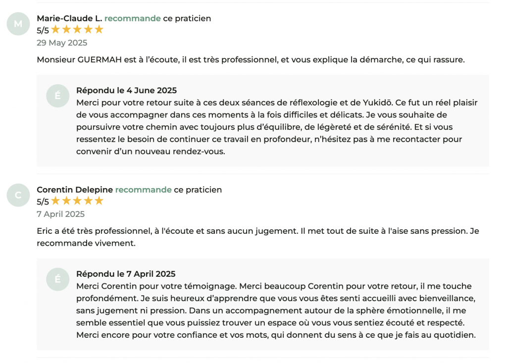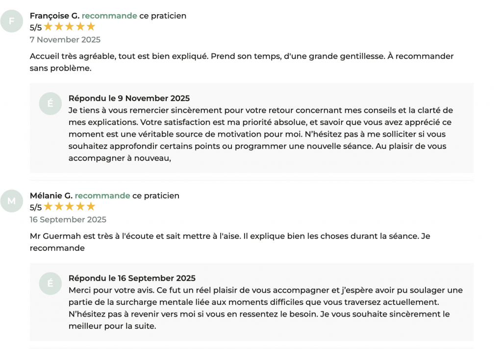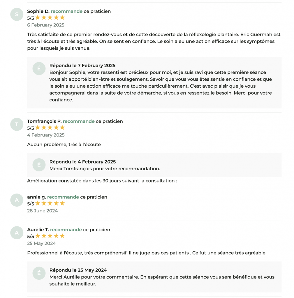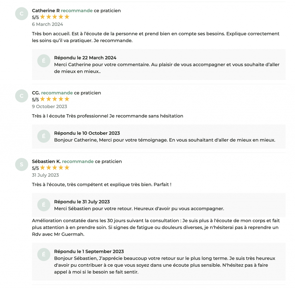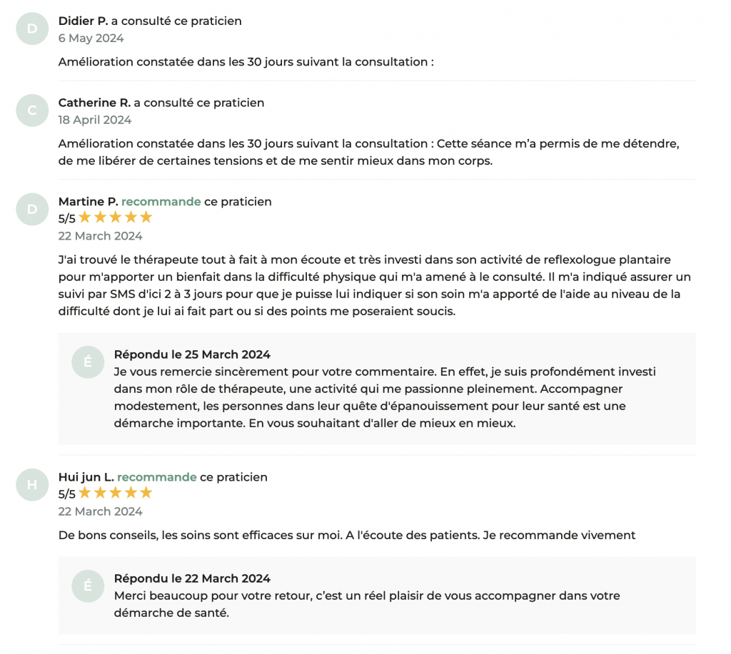 Vous trouverez ci-dessous les témoignages laissés par mes clients lors de mon passage sur la plateforme Médoucine.